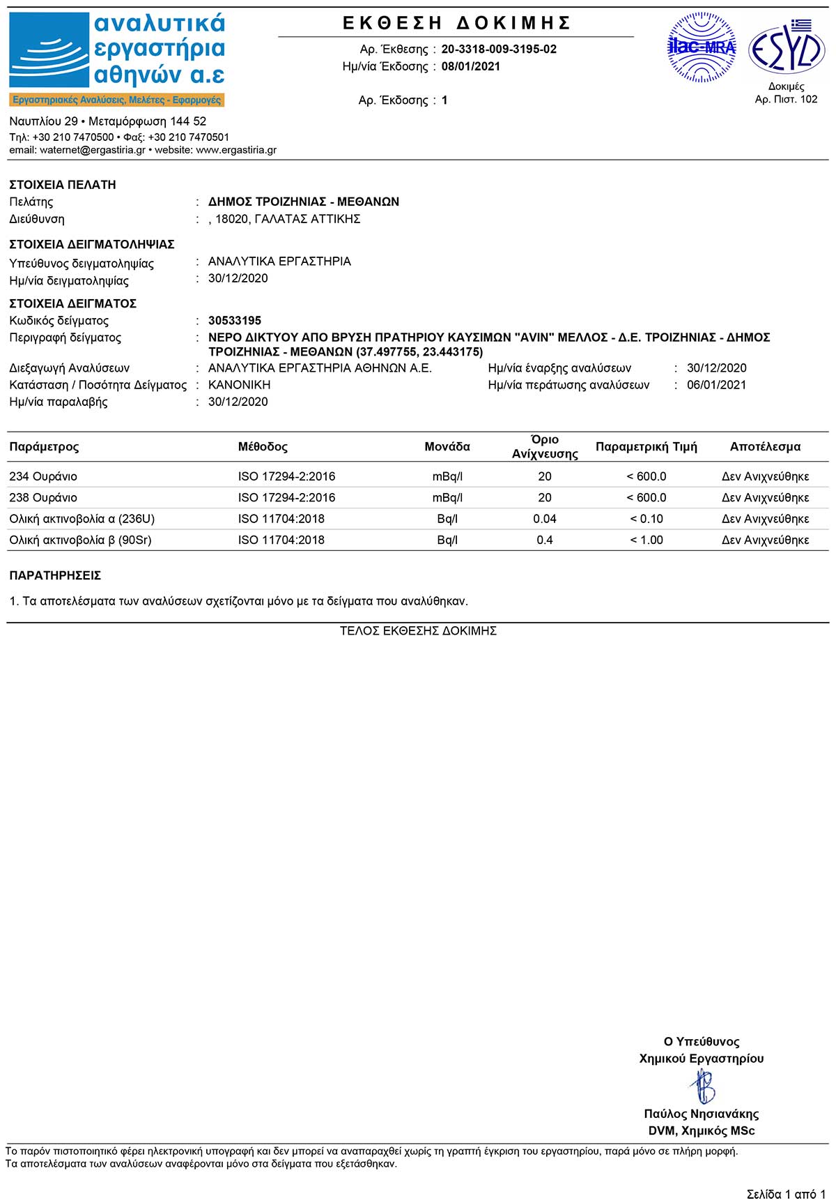 Αναλύσεις πόσιμου νερού Κοινότητας Γαλατά
