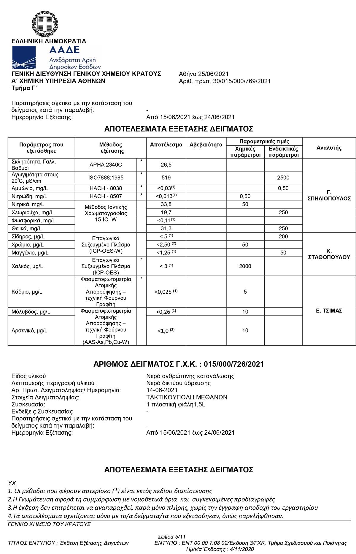 Αναλύσεις πόσιμου νερού Κοινότητας Τακτικουπόλεως