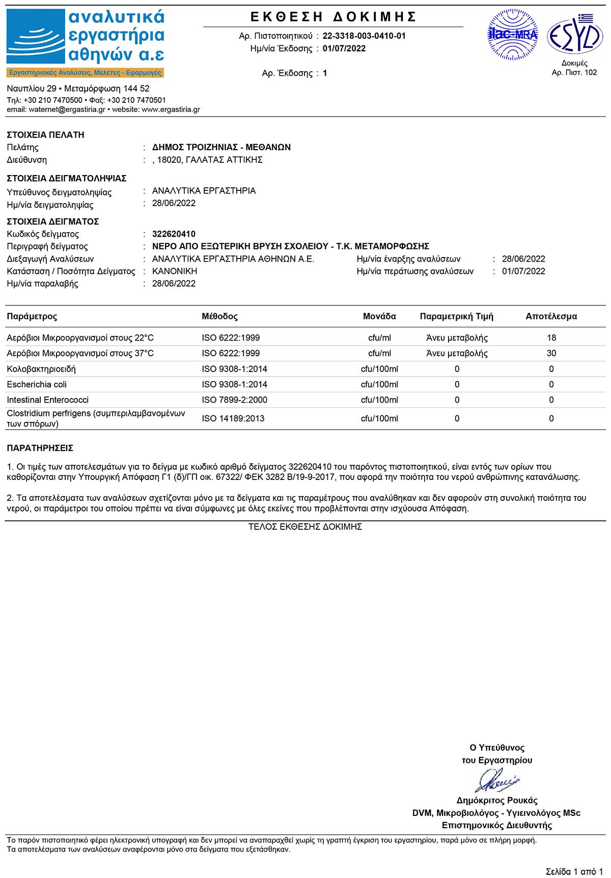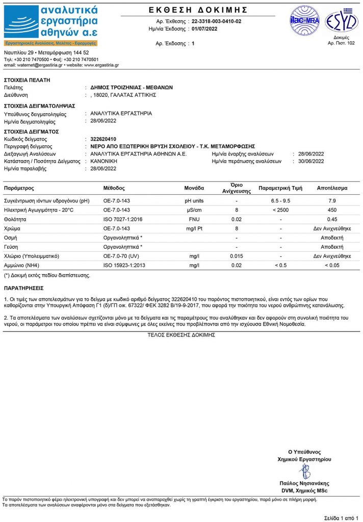 Αναλύσεις πόσιμου νερού Μεταμόρφωσης
