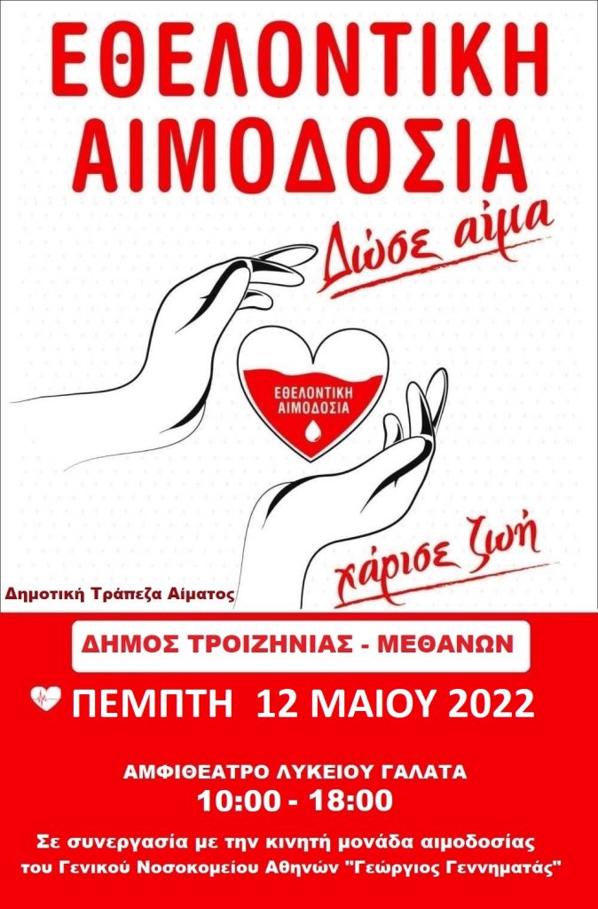 Ο Δήμος Τροιζηνίας – Μεθάνων διοργάνωσε Εθελοντική Αιμοδοσία την Πέμπτη 12 Μαΐου του 2022, στον Γαλατά, από τις 10.00 μέχρι τις 18.00, στο Αμφιθέατρο του Λυκείου Γαλατά, σε συνεργασία με την κινητή μονάδα αιμοδοσίας του Γενικού Νοσοκομείου ΑΘηνών “Γεώργιος Γεννηματάς”.