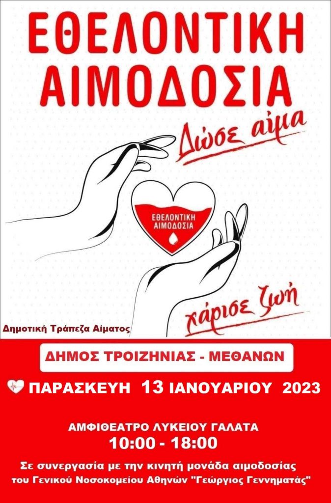 Ο Δήμος Τροιζηνίας – Μεθάνων διοργάνωσε Εθελοντική Αιμοδοσία την Παρασκευή 13 Ιανουαρίου του 2023, στον Γαλατά, από τις 10.00 μέχρι τις 18.00, στο Αμφιθέατρο του Λυκείου Γαλατά, σε συνεργασία με την κινητή μονάδα αιμοδοσίας του Γενικού Νοσοκομείου ΑΘηνών “Γεώργιος Γεννηματάς”.