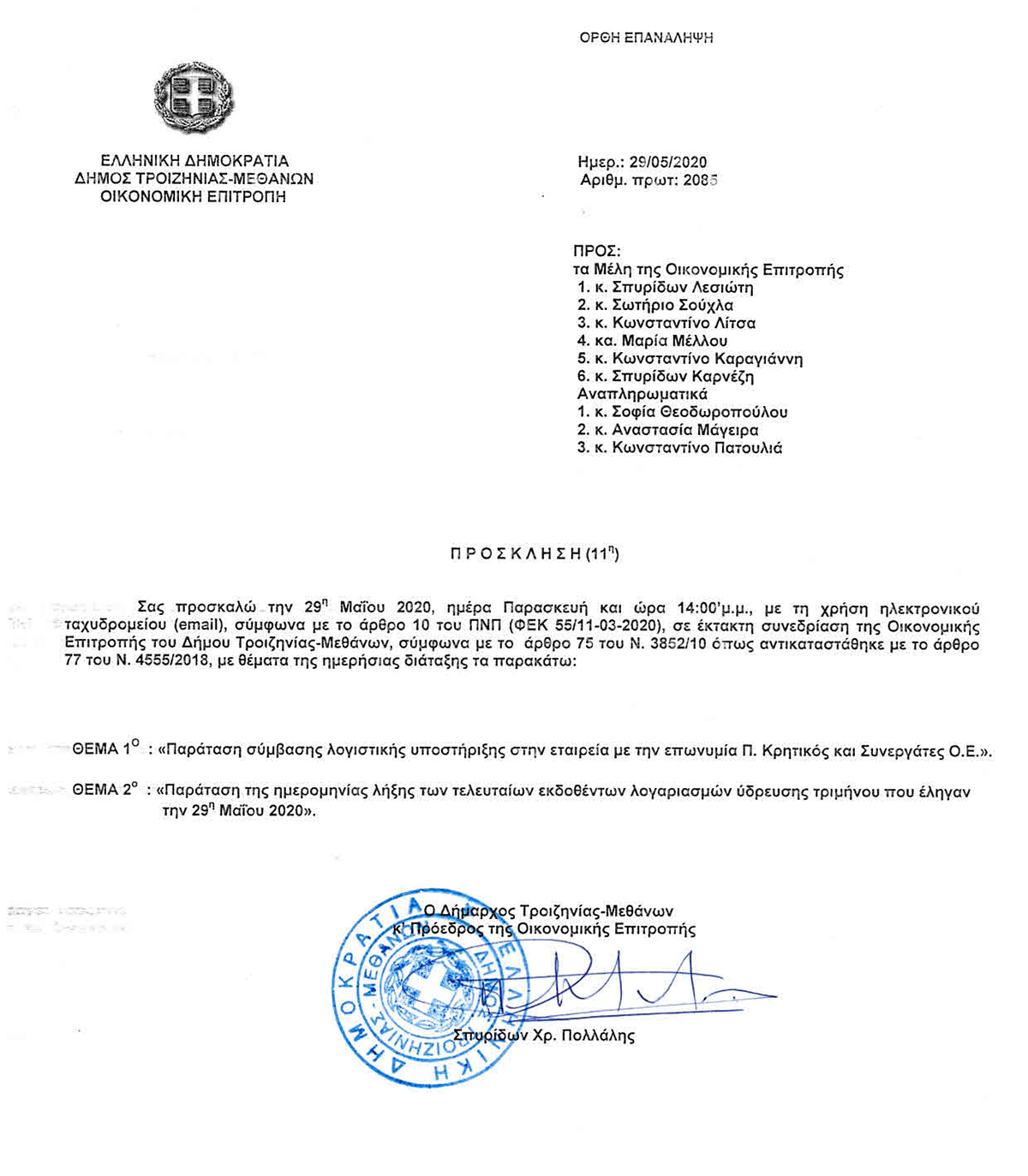 11η Έκτακτη Συνεδρίαση, Παρασκευή 29 Μαΐου 2020