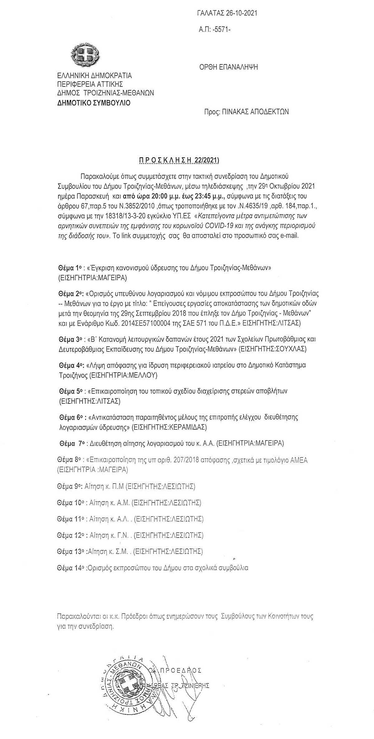 22η Τακτική Συνεδρίαση, Παρασκευή 29 Οκτωβρίου 2021