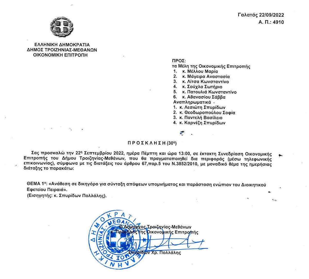 30η Έκτακτη Συνεδρίαση, Πέμπτη 22 Σεπτεμβρίου 2022