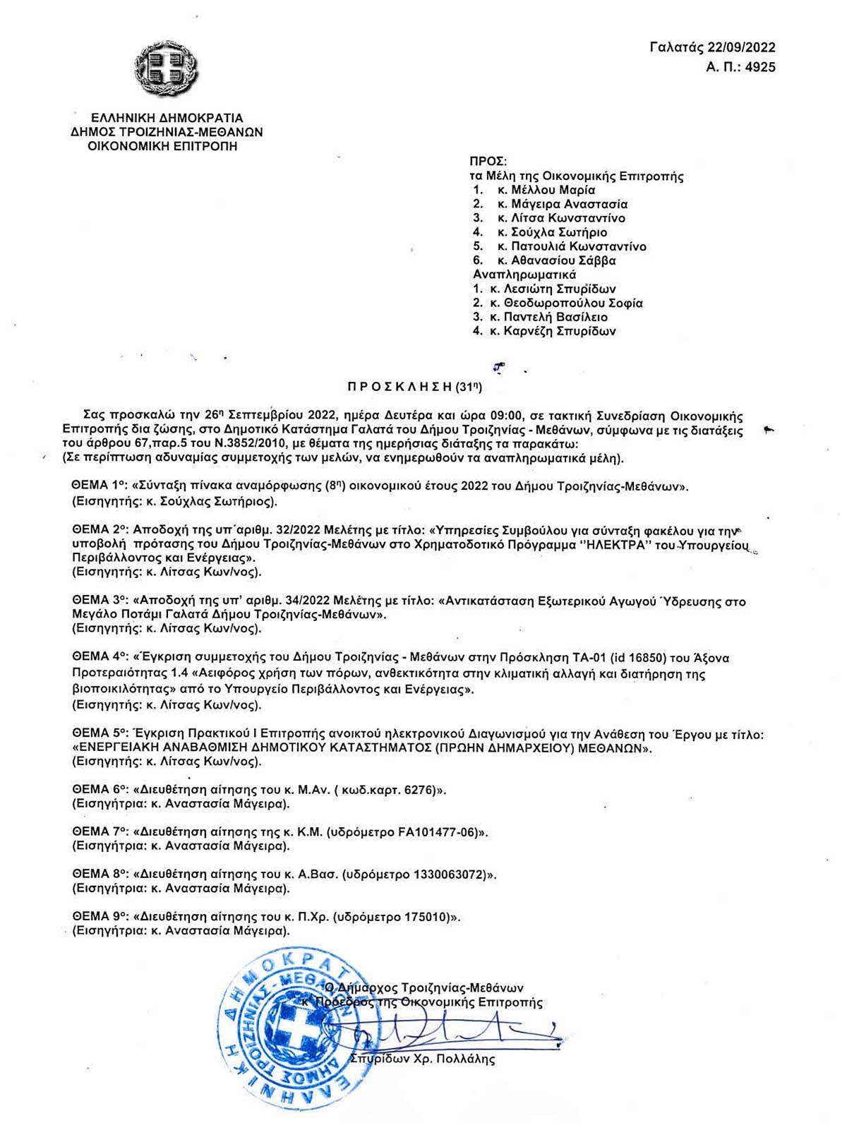 31η Τακτική Συνεδρίαση, Δευτέρα 26 Σεπτεμβρίου 2022