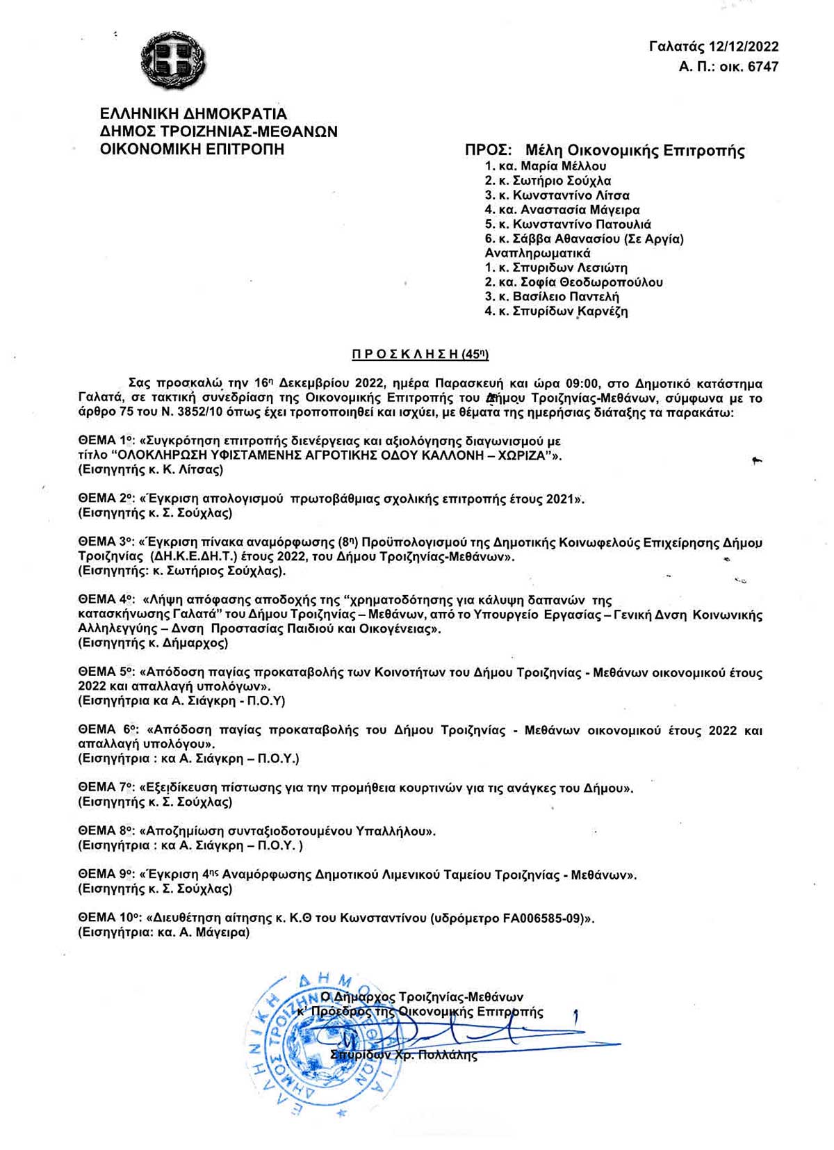 45η Τακτική Συνεδρίαση, Παρασκευή 16 Δεκεμβρίου 2022