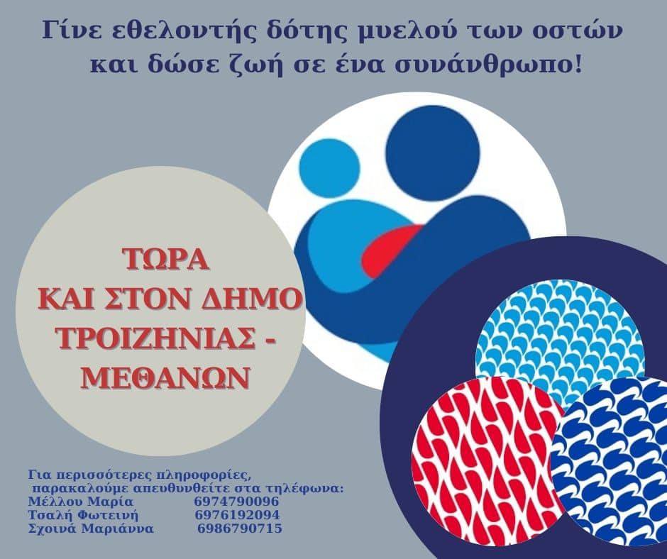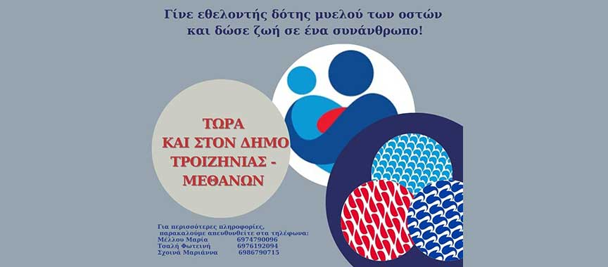 Ο Δήμος Τροιζηνίας – Μεθάνων, επιθυμώντας να στηρίξει το έργο του Συλλόγου «ΟΡΑΜΑ ΕΛΠΙΔΑΣ» και να συμμετέχει στην προσπάθεια ενημέρωσης και εγγραφής εθελοντών δοτών στην Τράπεζα Εθελοντών Δοτών Μυελού των Οστών, είναι πλέον ένας από τους Συνεργάτες και Συνεργαζόμενα Κέντρα Εγγραφής Εθελοντών Δοτών του Συλλόγου.