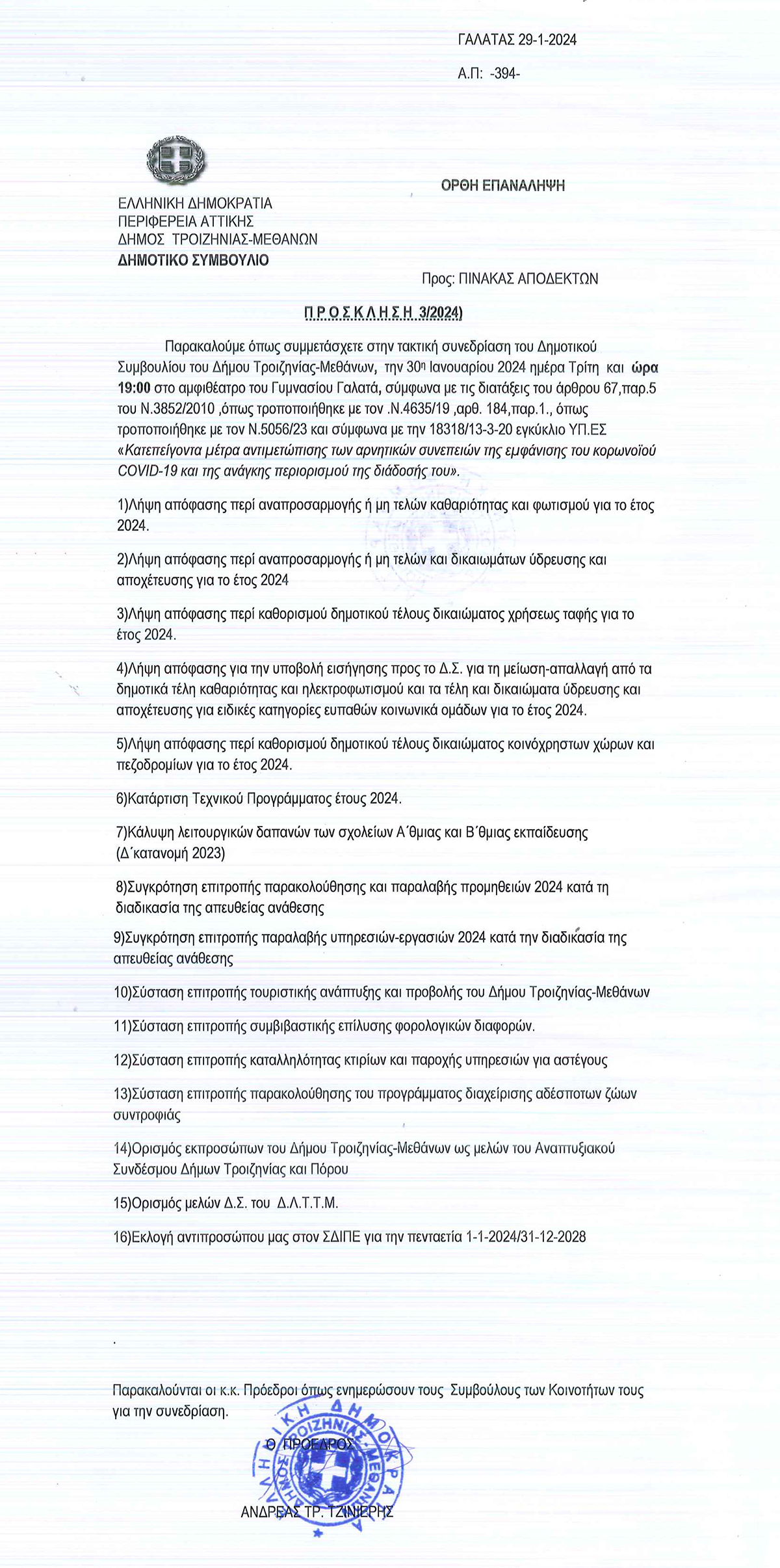 Παρακαλούμε όπως συμμετάσχετε στην τακτική συνεδρίαση του Δημοτικού Συμβουλίου του Δήμου Τροιζηνίας-Μεθάνων, την Τρίτη 30 Ιανουαρίου 2024 και ώρα 19.00