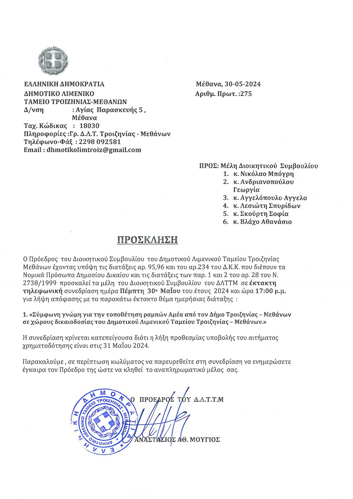 Ο Πρόεδρος του Διοικητικού Συμβουλίου του Δημοτικού Λιμενικού Ταμείου Τροιζηνίας – Μεθάνων προσκαλεί τα μέλη του Διοικητικού Συμβουλίου του ΔΛΤΤΜ σε έκτακτη τηλεφωνική συνεδρίαση την Πέμπτη 30 Μάιου 2024 και ώρα 17:00 μ.μ.