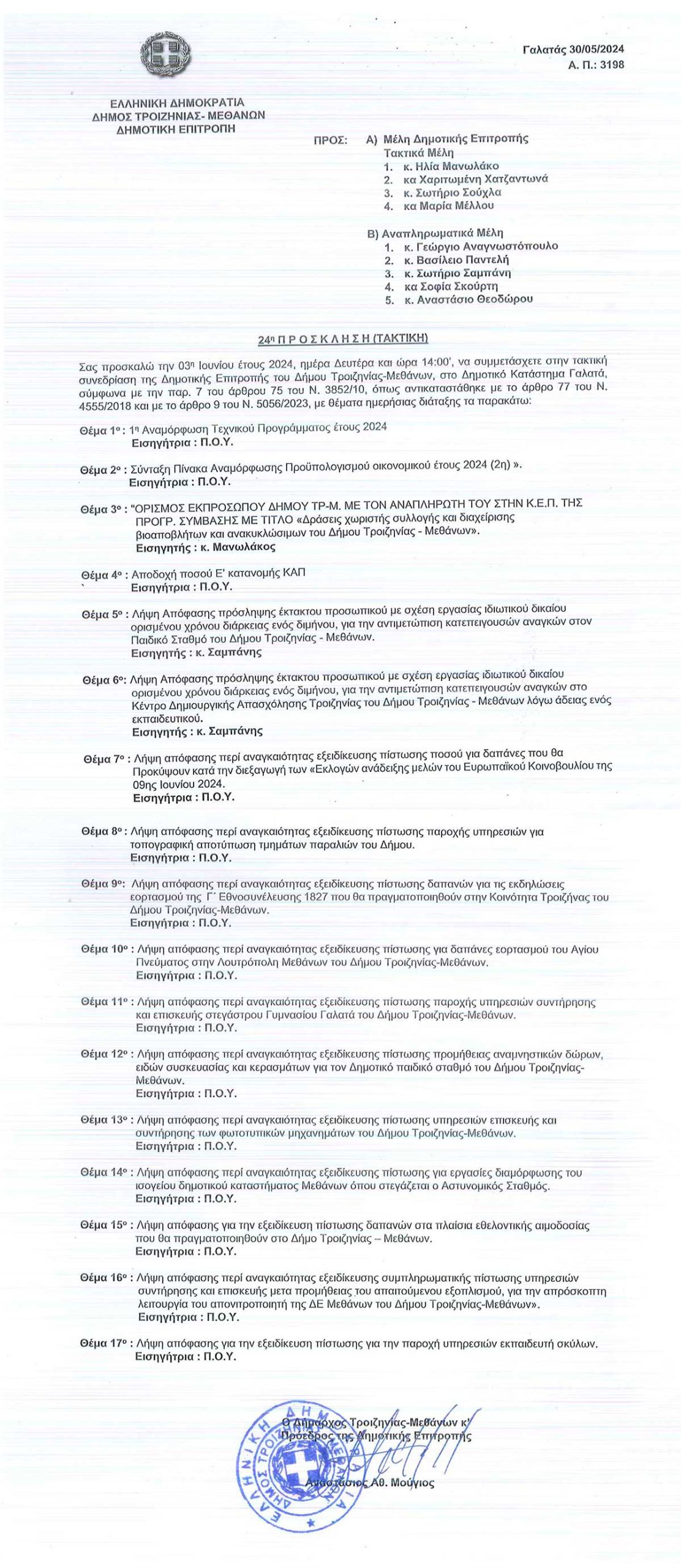 24η Τακτική Συνεδρίαση της Δημοτικής Επιτροπής του Δήμου Τροιζηνίας – Μεθάνων, Δευτέρα 3 Ιουνίου 2024 και ώρα 14:00
