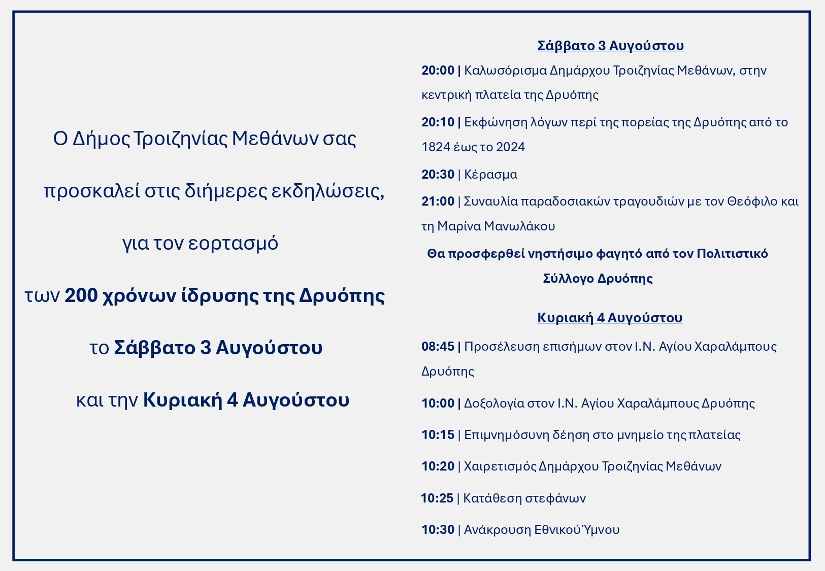 Ο Δήμος Τροιζηνίας Μεθάνων σας προσκαλεί στις διήμερες εκδηλώσεις που θα λάβουν χώρα το Σάββατο 03 Αυγούστου και την Κυριακή 04 Αυγούστου στη Δρυόπη για να τιμήσουμε τα 200 χρόνια ίδρυσης του χωριού 1824-2024