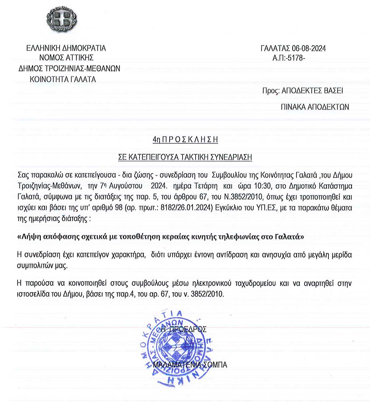 4η Κατεπείγουσα Συνεδρίαση της Κοινότητας του Γαλατά, την Τετάρτη 7 Αυγούστου 2024 και ώρα 10:30