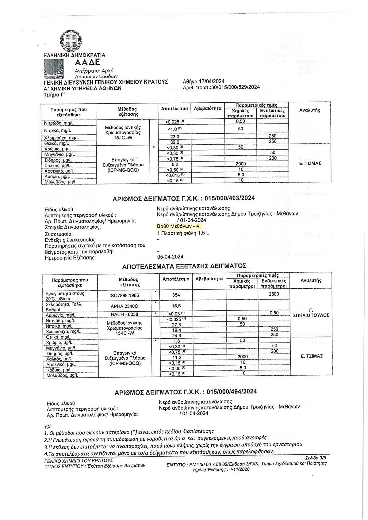 Αναλύσεις πόσιμου νερού Οικισμού Βαθύ