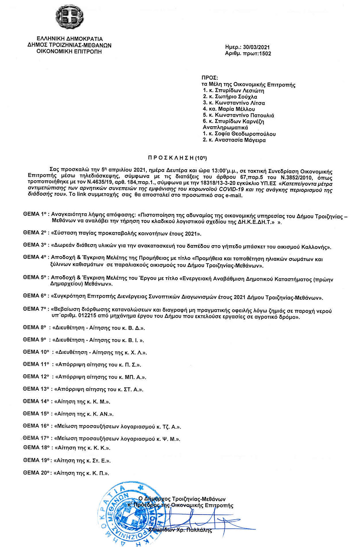 10η Τακτική Συνεδρίαση, Δευτέρα 5 Απριλίου 2021