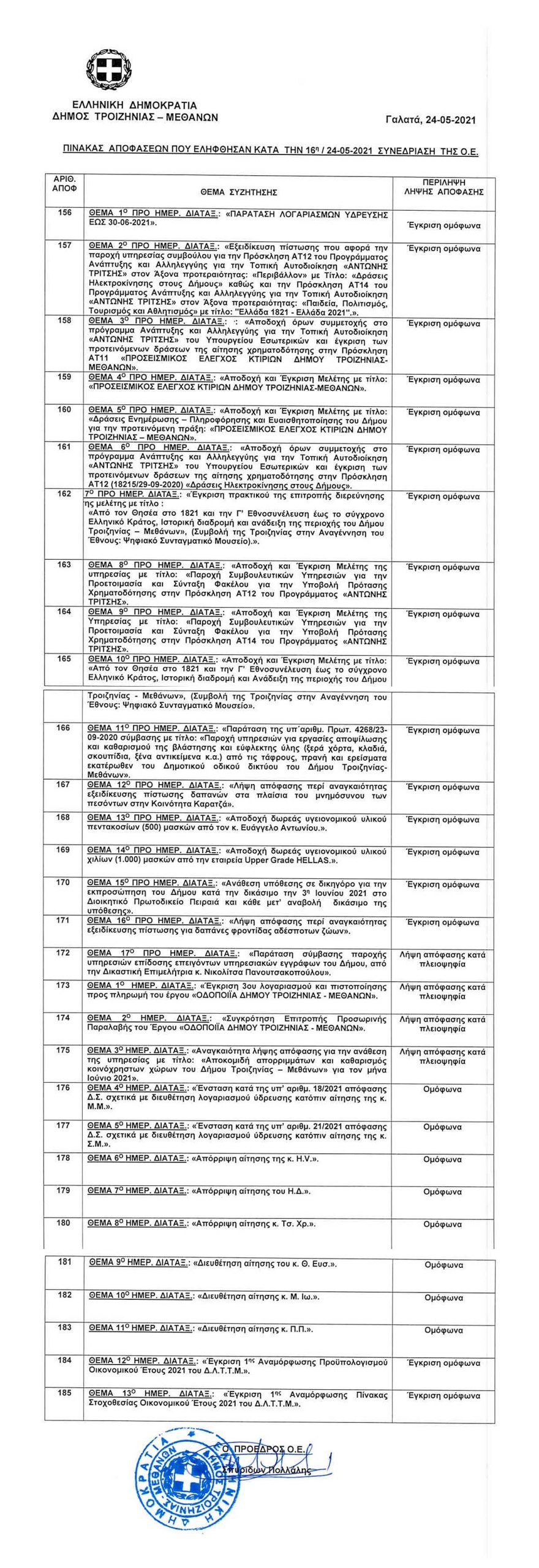16η Τακτική Δημόσια Συνεδρίαση, Δευτέρα 24 Μαϊου 2021