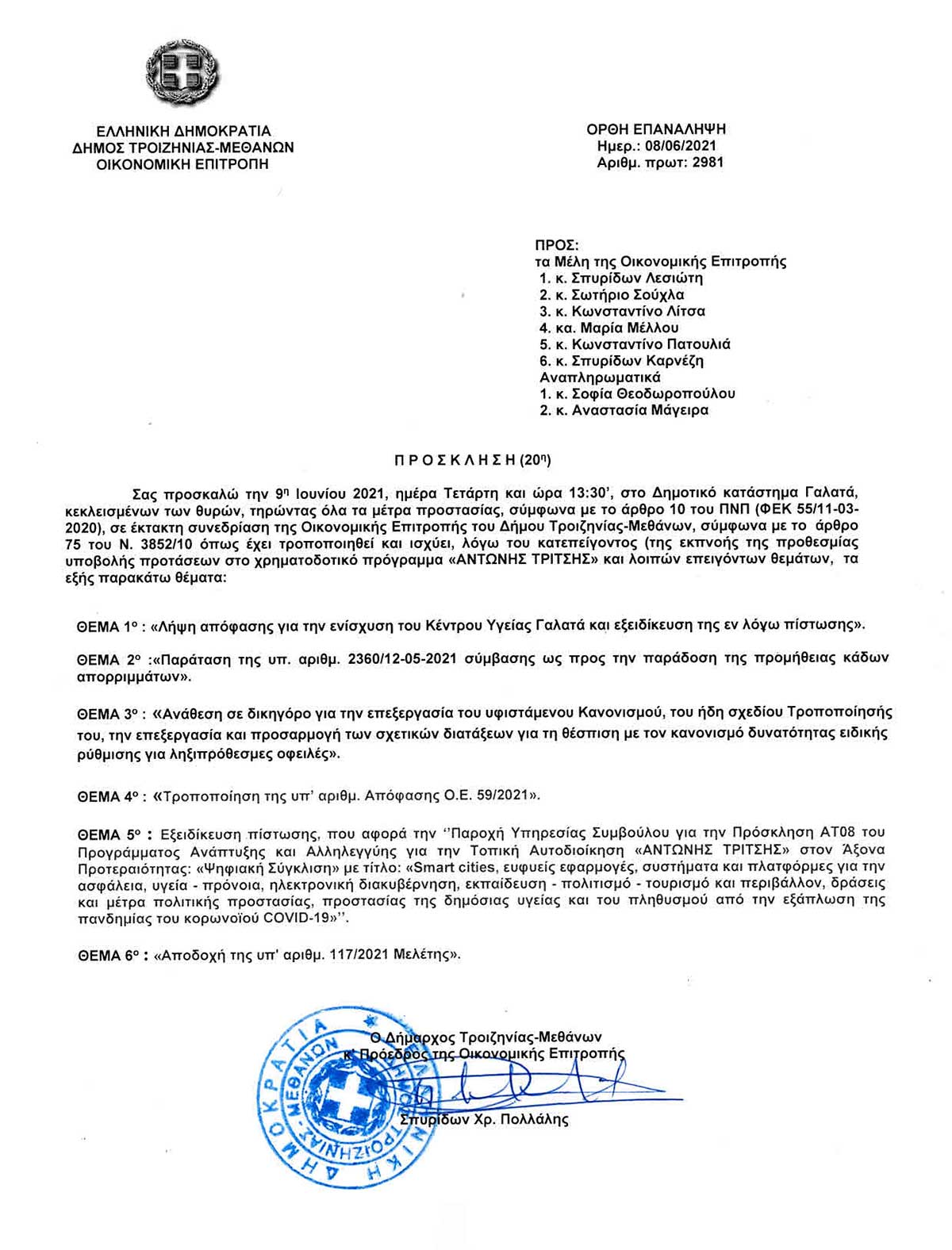 21η Έκτακτη Συνεδρίαση, Τρίτη 15 Ιουνίου 2021