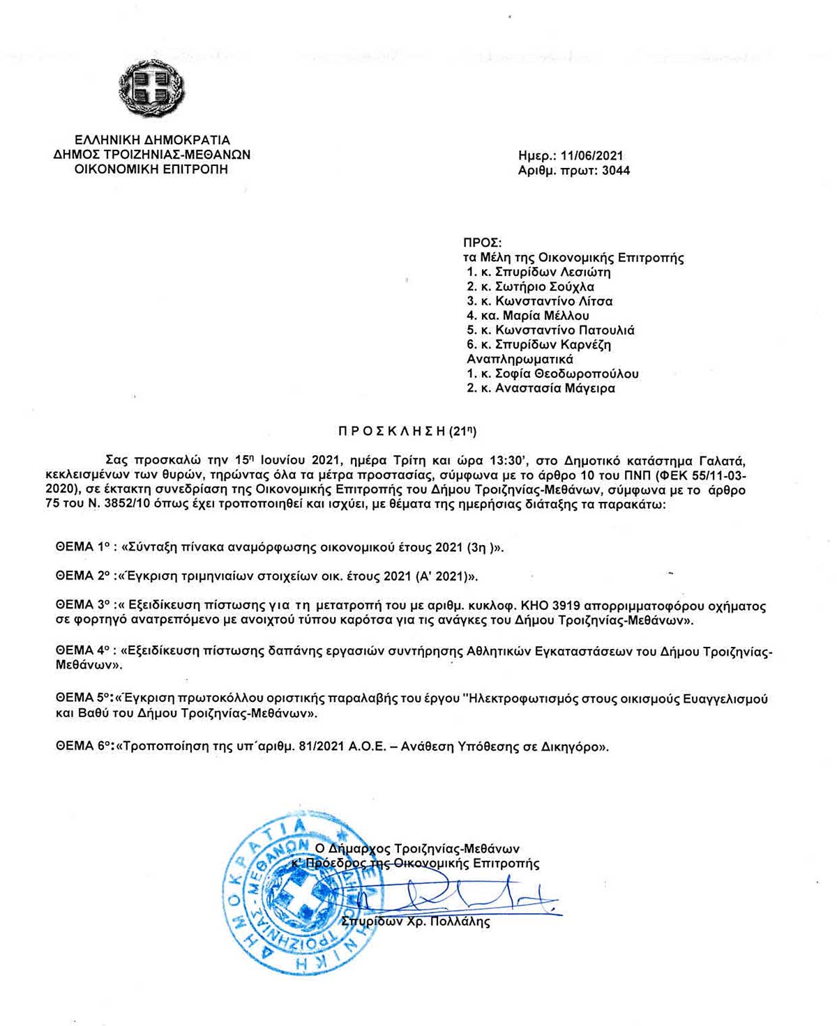 21η Έκτακτη Συνεδρίαση, Τρίτη 15 Ιουνίου 2021