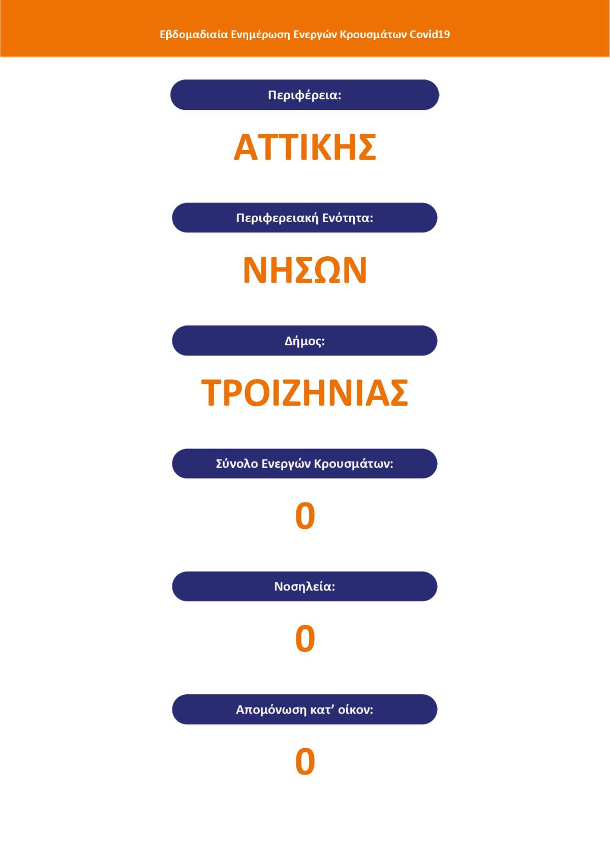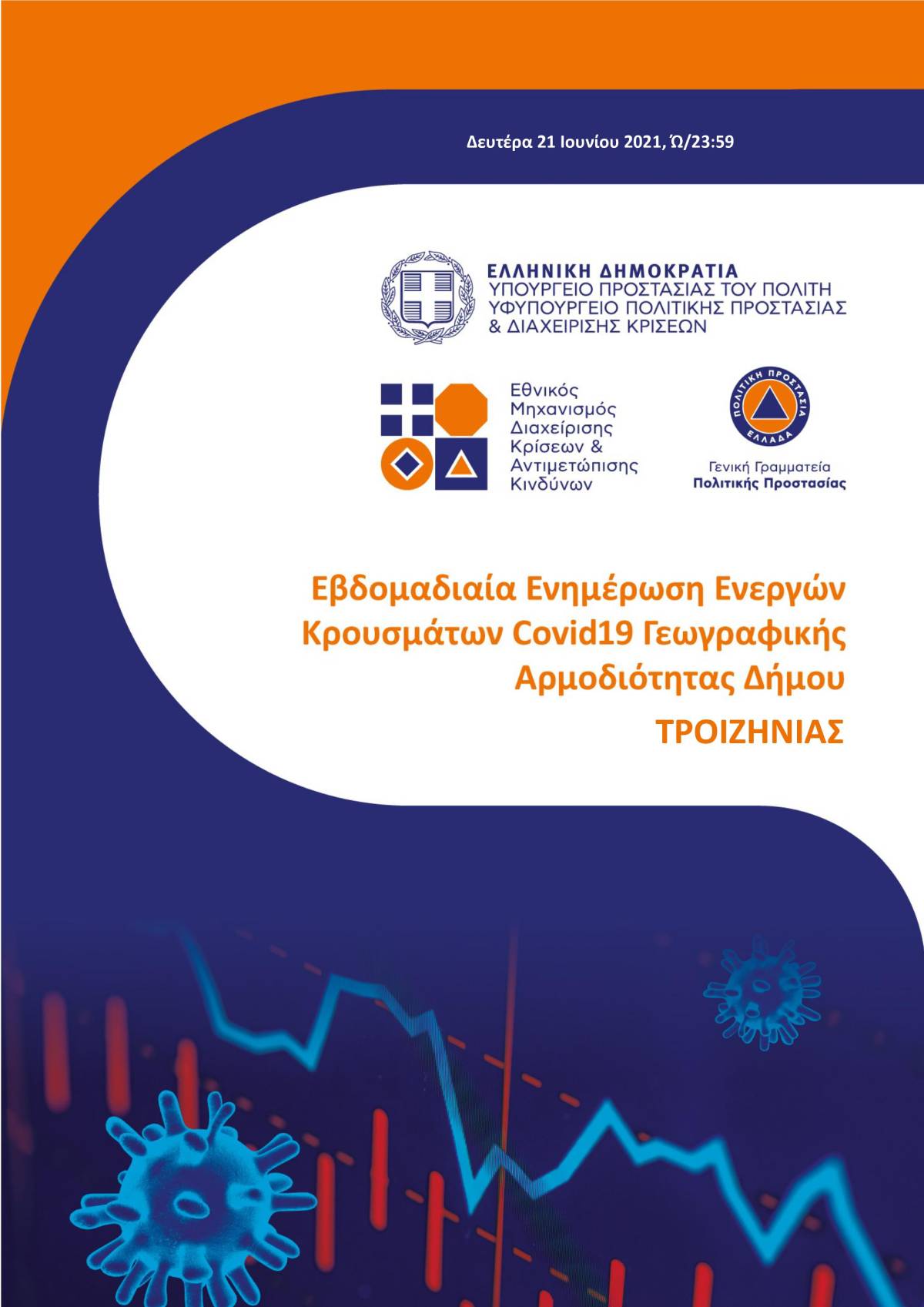 Ο Δήμος Τροιζηνίας – Μεθάνων σας παρουσιάζει την επίσημη Εβδομαδιαία Ενημέρωση Ενεργών Κρουσμάτων Covid-19, η οποία αποστέλλεται στον Δήμαρχο, από την Γενική Γραμματεία Πολιτικής Προστασίας.