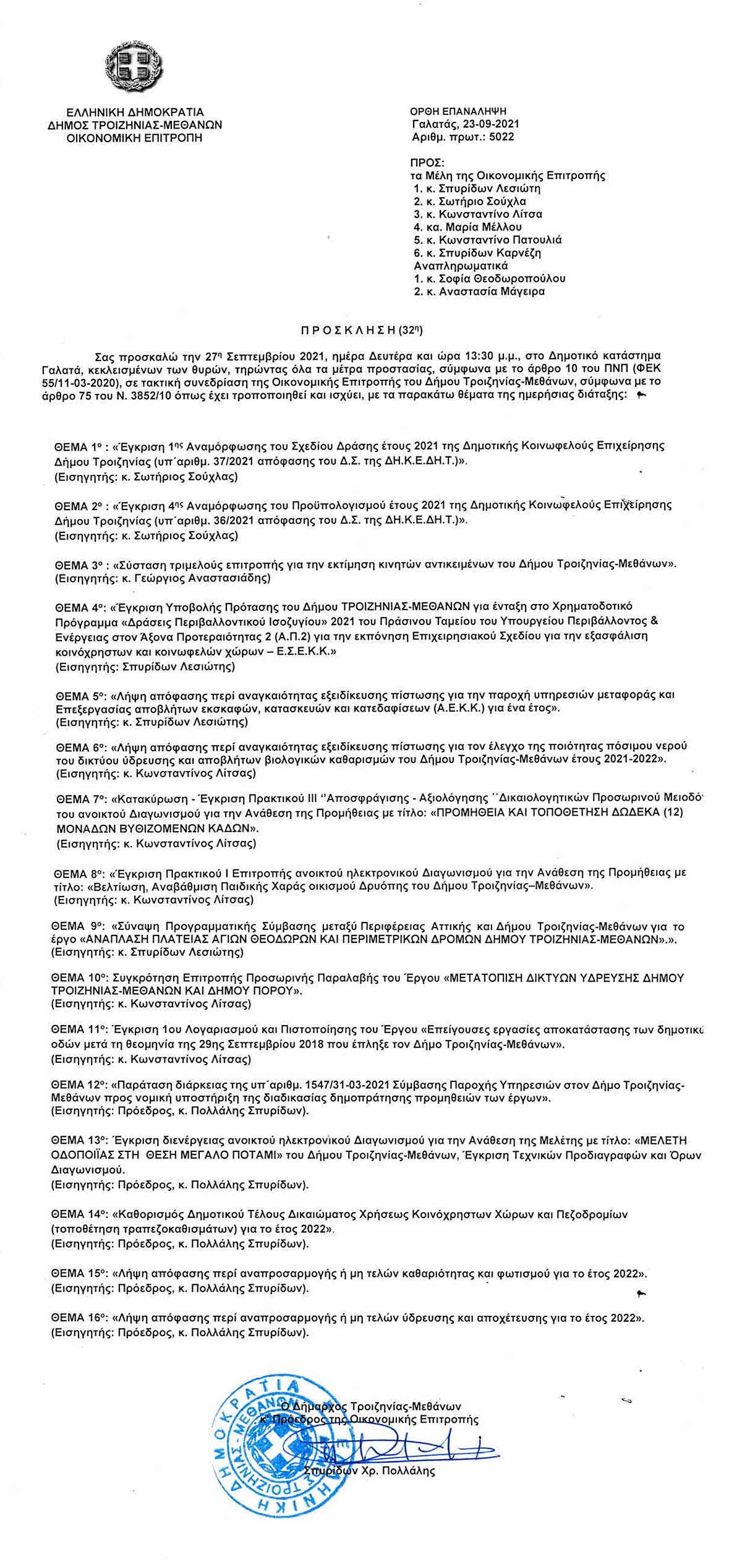 32η Τακτική Δημόσια Συνεδρίαση, Δευτέρα 27 Σεπτεμβρίου 2021