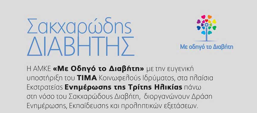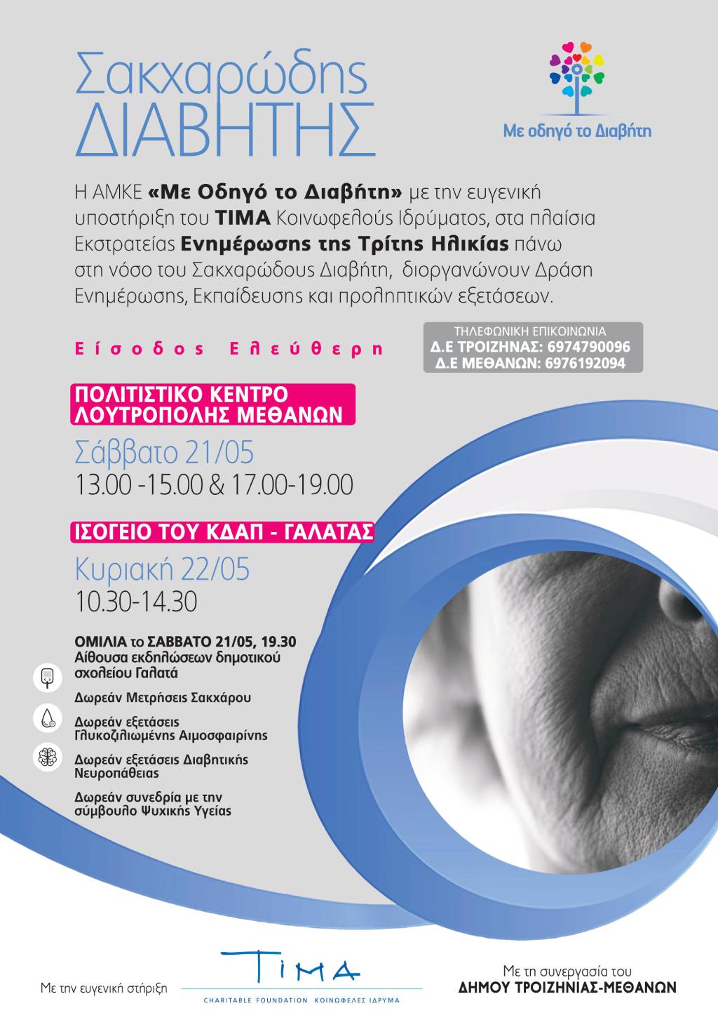 Ο Δήμος Τροιζηνίας – Μεθάνων σε συνεργασία με την AMKE «Με Οδηγό το Διαβήτη» με την ευγενική υποστήριξη του Κοινωφελούς Ιδρύματος ΤΙΜΑ και το Τμήμα Προάσπισης και Προαγωγής της Δημόσιας Υγείας, στα πλαίσια Εκστρατείας Ενημέρωσης της Τρίτης Ηλικίας πάνω στη νόσο του Σακχαρώδους Διαβήτη, διοργανώνουν Δράση Ενημέρωσης, Εκπαίδευσης και Προληπτικών Εξετάσεων στο Δήμο Τροιζηνίας – Μεθάνων.