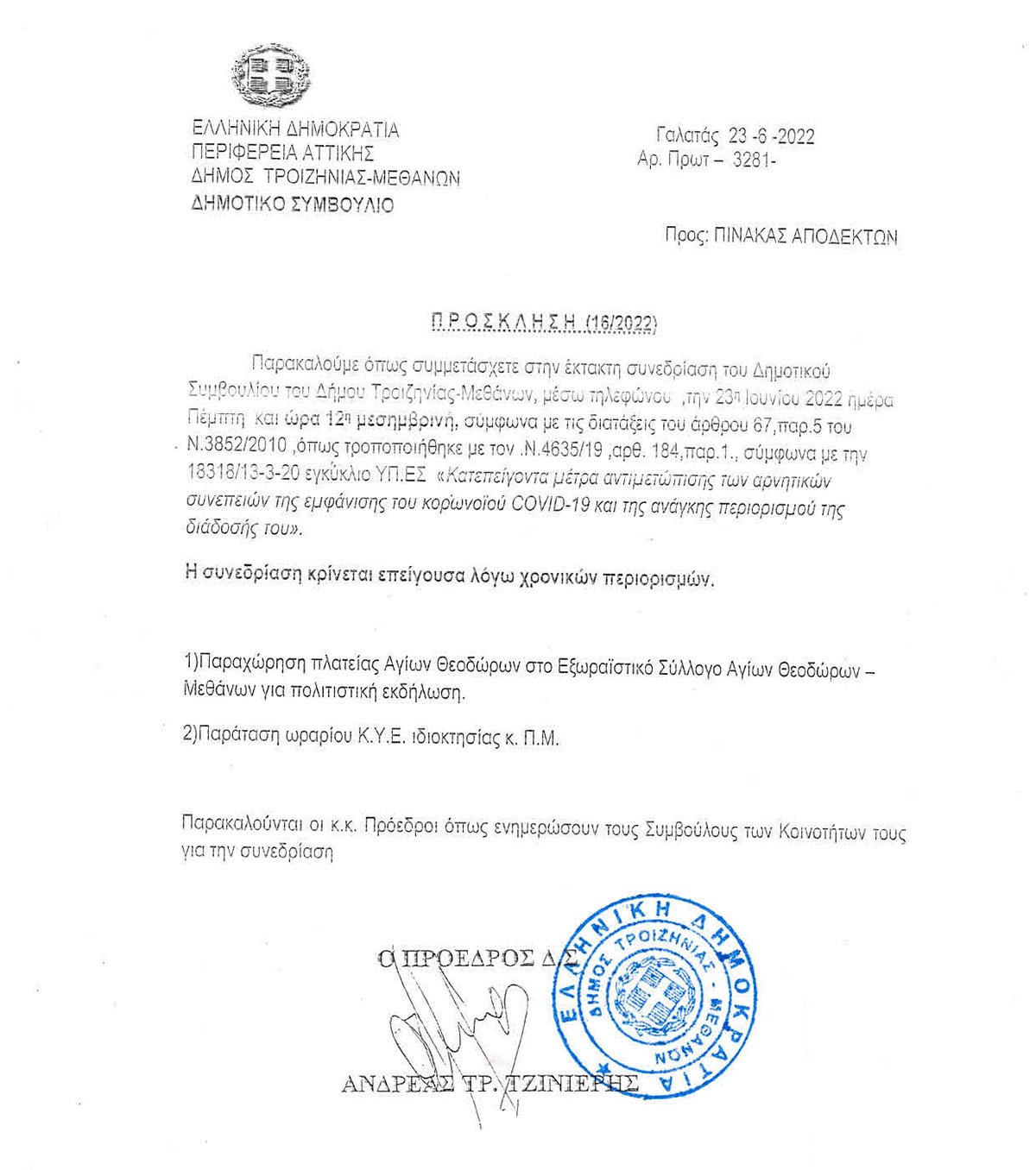 16η Έκτακτη Συνεδρίαση, Πέμπτη 23 Ιουνίου 2022