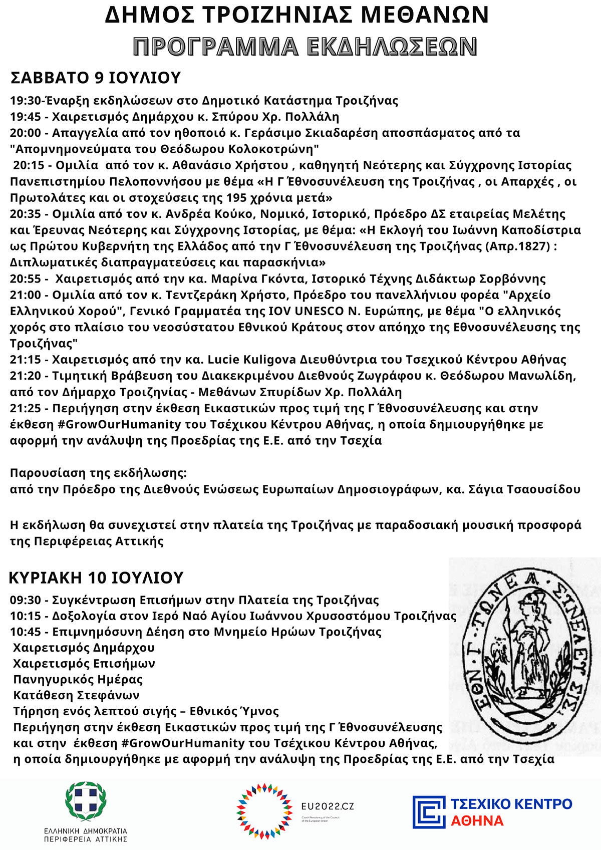 Πρόγραμμα επετειακών εκδηλώσεων της Εν Τροιζήνι κατ’ επανάληψιν Γ’ Εθνική των Ελλήνων Συνέλευσις, στις 9 και 10 Ιουλίου 2022