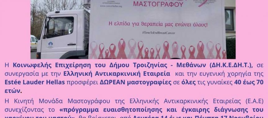 Με αφορμή την Παγκόσμια Ημέρα Πρόληψης Κατά του Καρκίνου του Μαστού, η οποία γιορτάζεται κάθε χρόνο στις 25 Οκτωβρίου, η Κοινωφελής Επιχείρηση του Δήμου Τροιζηνίας – Μεθάνων, σε συνεργασία με την Ελληνική Αντικαρκινική Εταιρεία (Ε.Α.Ε.) και την εταιρεία καλλυντικών Estée Lauder Hellas, προσφέρει την δυνατότητα σε όλες τις γυναίκες ηλικίας 40 έως 70 ετών να εξεταστούν δωρεάν το τετραήμερο 14 έως 17 Νοεμβρίου!