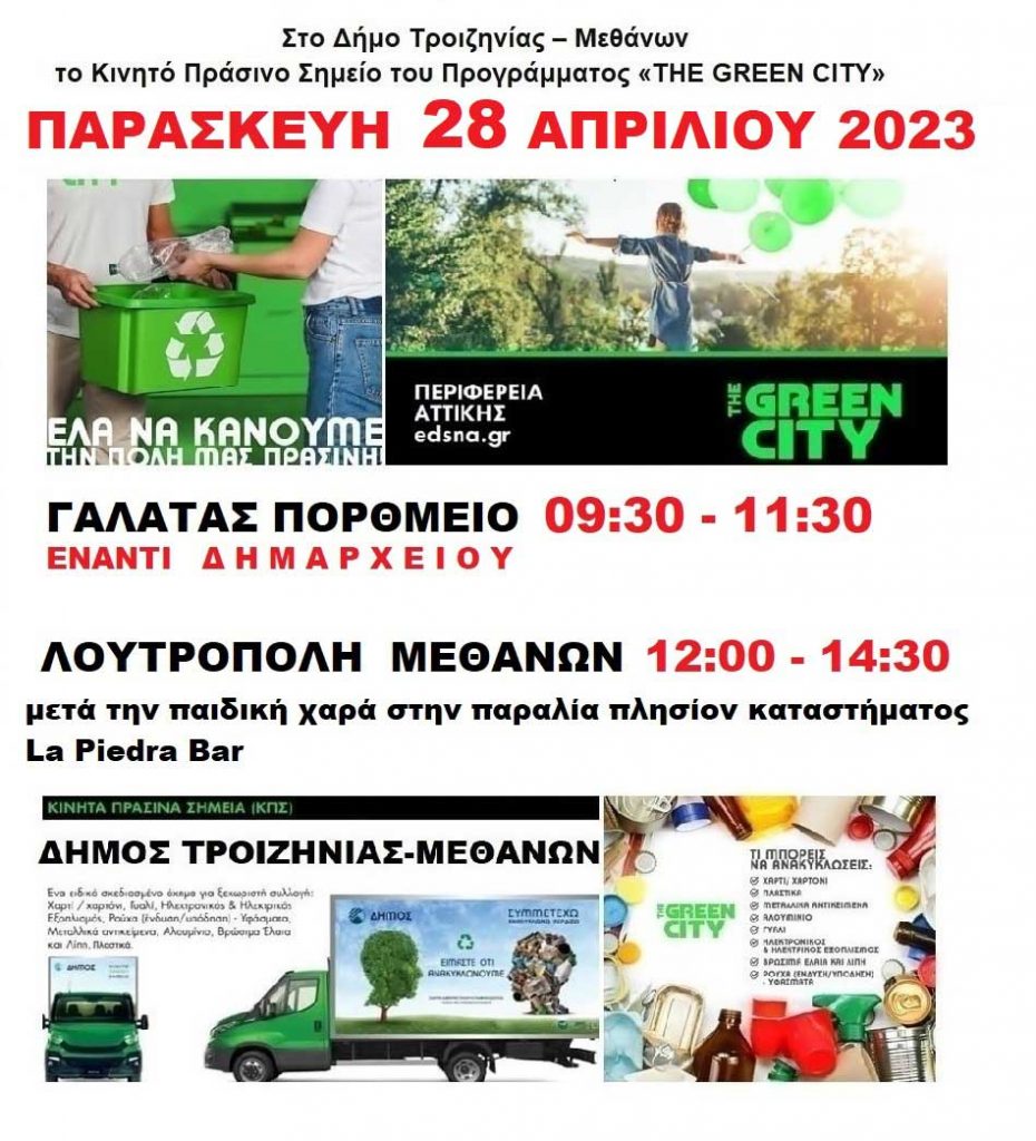 Στον Δήμο Τροιζηνίας – Μεθάνων το Κινητό Πράσινο Σημείο του Προγράμματος «The Green City», στις 28 Απριλίου θα βρίσκεται στο Πορθμείο του Γαλατά στις 09.30-11.30 και στην Λουτρόπολη Μεθάνων στις 12.00-14.30