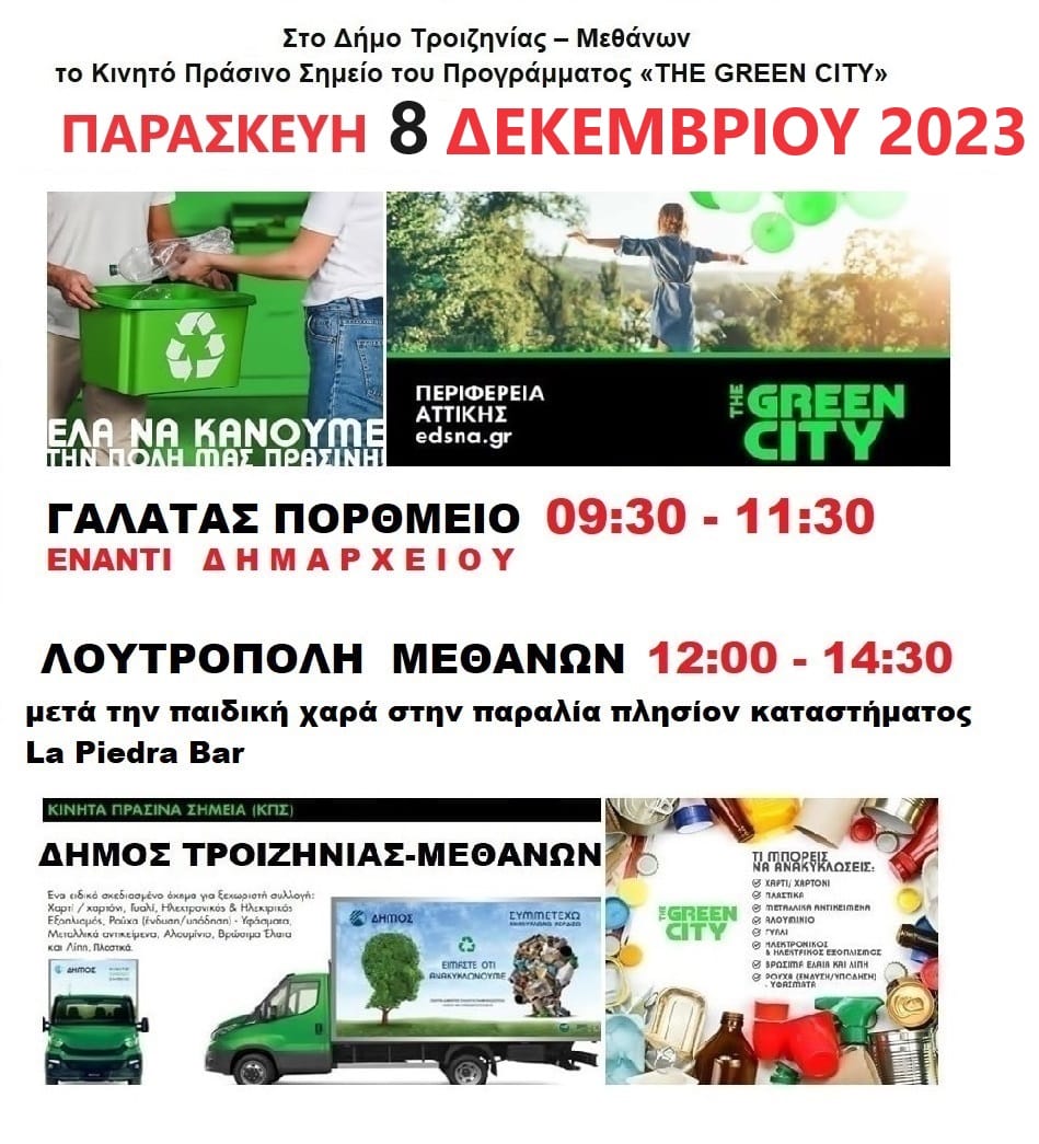 Στον Δήμο Τροιζηνίας – Μεθάνων το Κινητό Πράσινο Σημείο του Προγράμματος «The Green City», στις 8 Δεκεμβρίου 2023 θα βρίσκεται στο Πορθμείο του Γαλατά στις 09.30-11.30 και στην Λουτρόπολη Μεθάνων στις 12.00-14.30