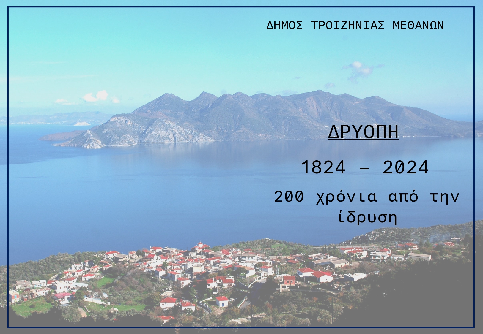 Ο Δήμος Τροιζηνίας Μεθάνων σας προσκαλεί στις διήμερες εκδηλώσεις που θα λάβουν χώρα το Σάββατο 03 Αυγούστου και την Κυριακή 04 Αυγούστου στη Δρυόπη για να τιμήσουμε τα 200 χρόνια ίδρυσης του χωριού 1824-2024.