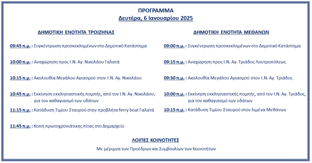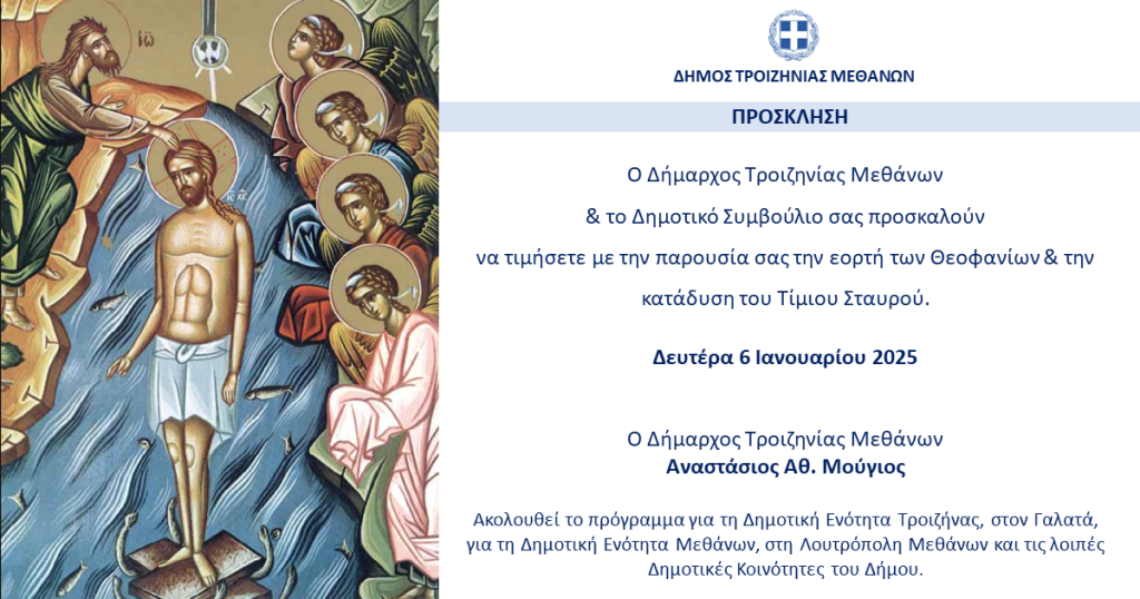 Ο Δήμος Τροιζηνίας-Μεθάνων σας προσκαλεί στην εορτή των Θεοφανίων και την κατάδυση του Τίμιου Σταυρού