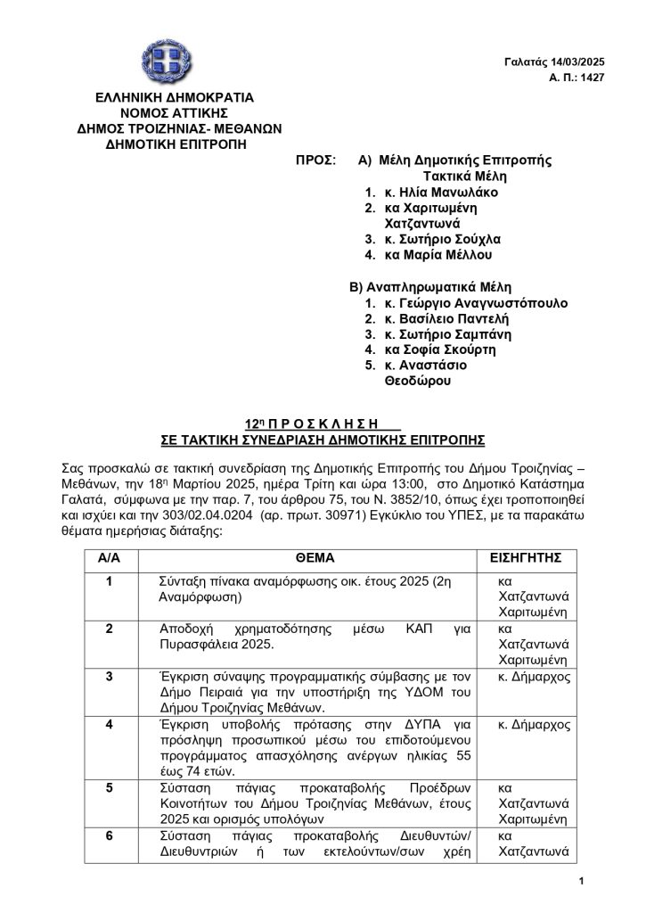 1η Τακτική Συνεδρίαση, Δευτέρα 17 Μαρτίου 2025 και ώρα...