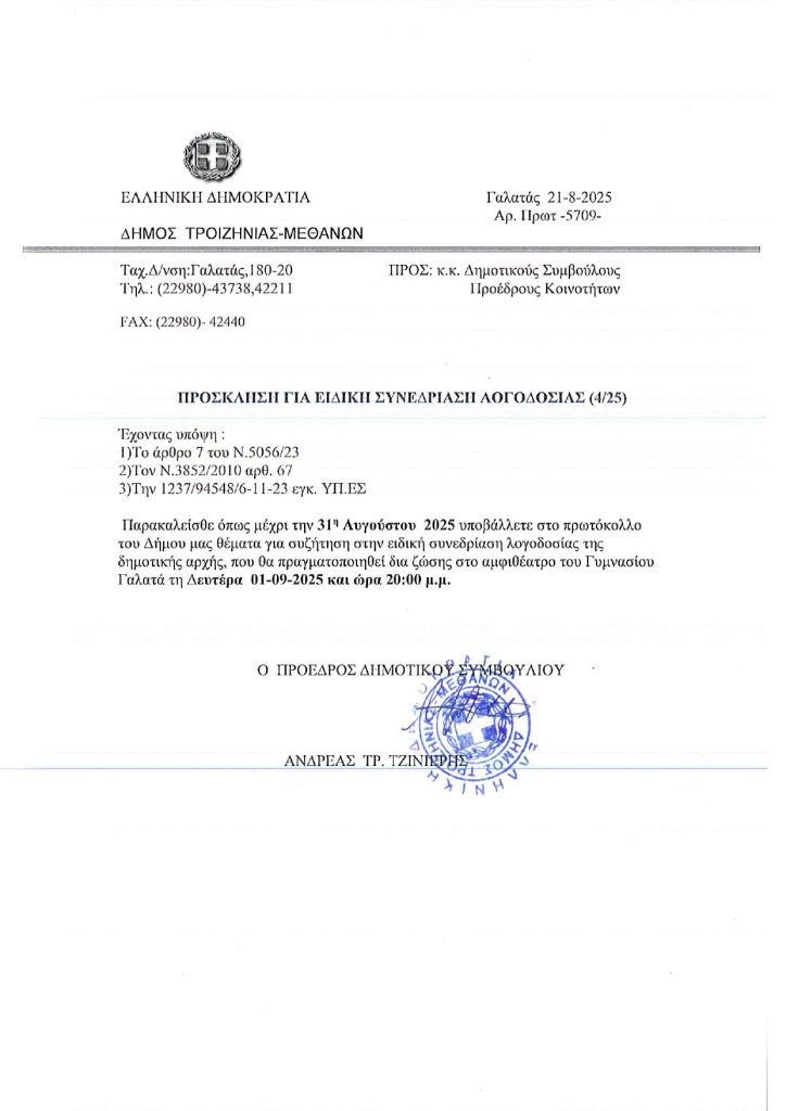 Πρόσκληση για την 4η Ειδική Συνεδρίαση Λογοδοσίας της Δημοτικής Αρχής