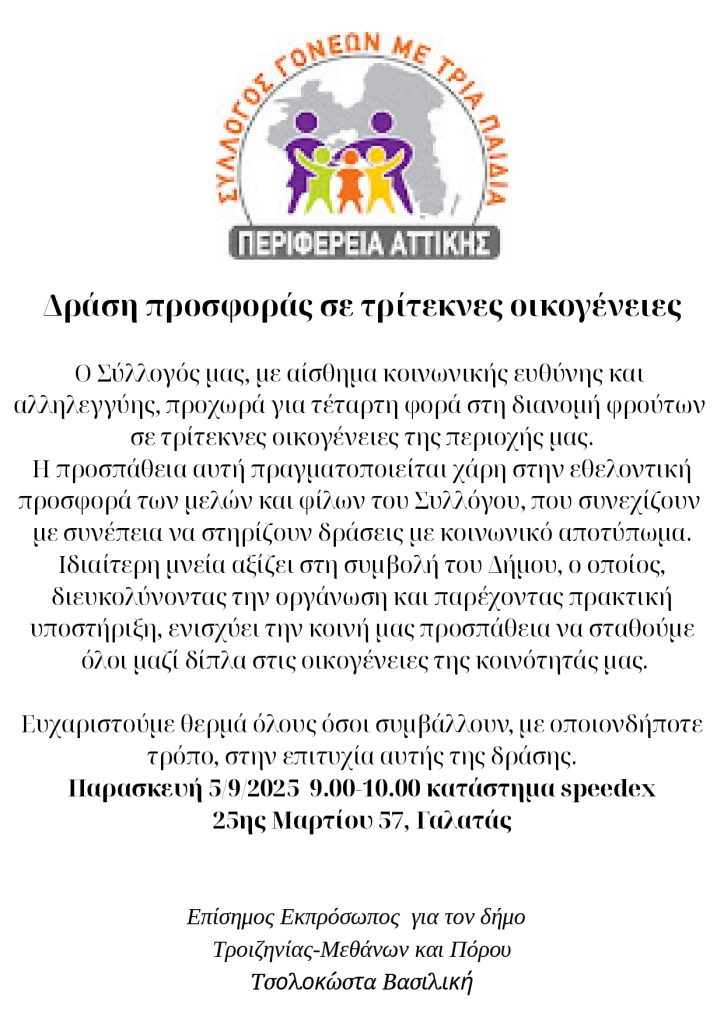 Δράση προσφοράς σε τρίτεκνες οικογένειες