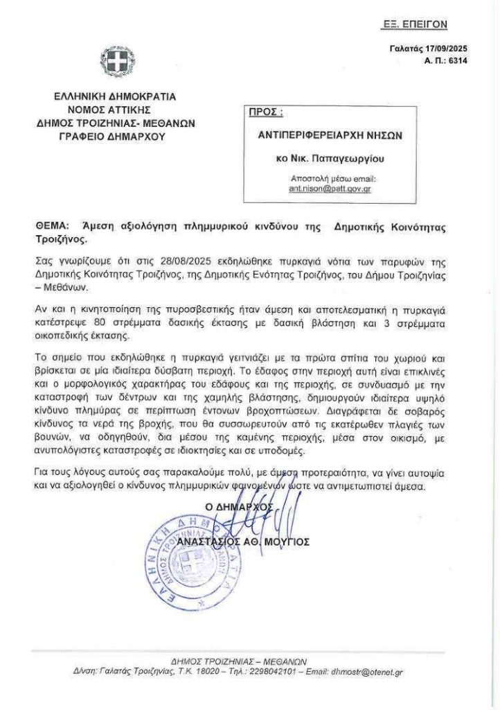 Αμέσως μετά την κατάσβεση της πρόσφατης πυρκαγιάς στην Τροιζήνα, ο Δήμαρχος Τροιζηνίας – Μεθάνων, κος Τάσος Μούγιος, ζήτησε κατεπείγουσα συνάντηση εργασίας με την Περιφέρεια Αττικής, ώστε να γίνει άμεση αξιολόγηση της κατάστασης, να καταδειχθεί το μέγεθος του πλημμυρικού κινδύνου και να προγραμματιστούν αντιπλημμυρικά έργα για την Τροιζήνα.