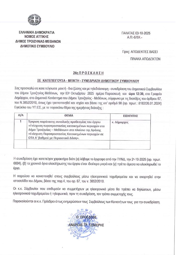 24η κατεπείγουσα – μεικτή Συνεδρίαση του Δημοτικού Συμβουλίου, Παρασκευή 3η Οκτωβρίου 2025 και ώρα 12:30